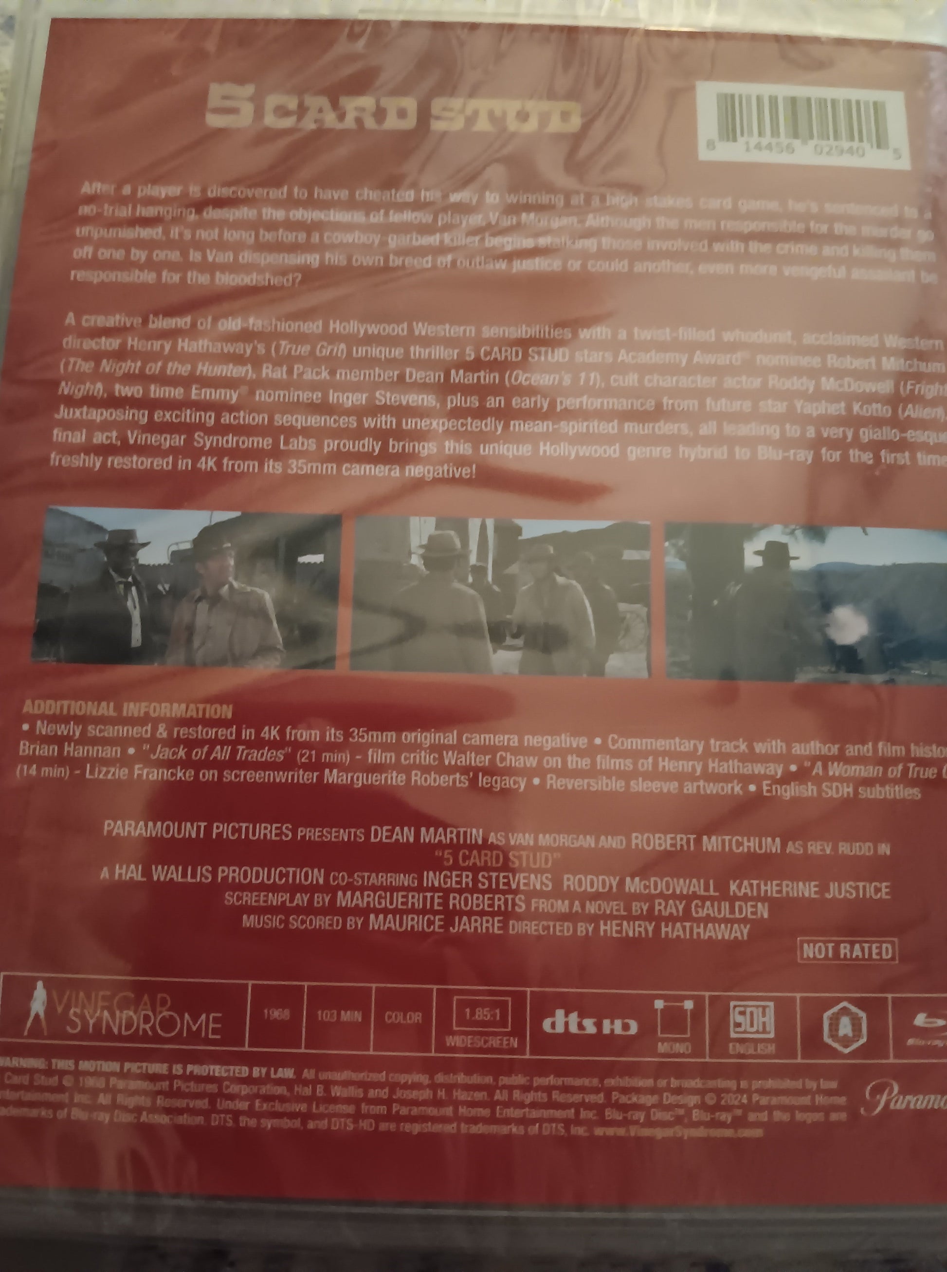 A creative blend of old-fashioned Hollywood Western sensibilities with a twist-filled whodunit, acclaimed Western director Henry Hathaway’s (True Grit) unique thriller 5 CARD STUD stars Academy Award® nominee Robert Mitchum (The Night of the Hunter), Rat Pack member Dean Martin (Ocean’s 11), cult character actor Roddy McDowell (Fright Night), two time Emmy® nominee Inger Stevens, plus an early performance from future star Yaphet Kotto (Alien). Juxtaposing exciting action sequences with unexpectedly mean-spirited murders, all leading to a very giallo-esque final act, Vinegar Syndrome Labs proudly brings this unique Hollywood genre hybrid to Blu-ray for the first time, freshly restored in 4K from its 35mm camera negative!