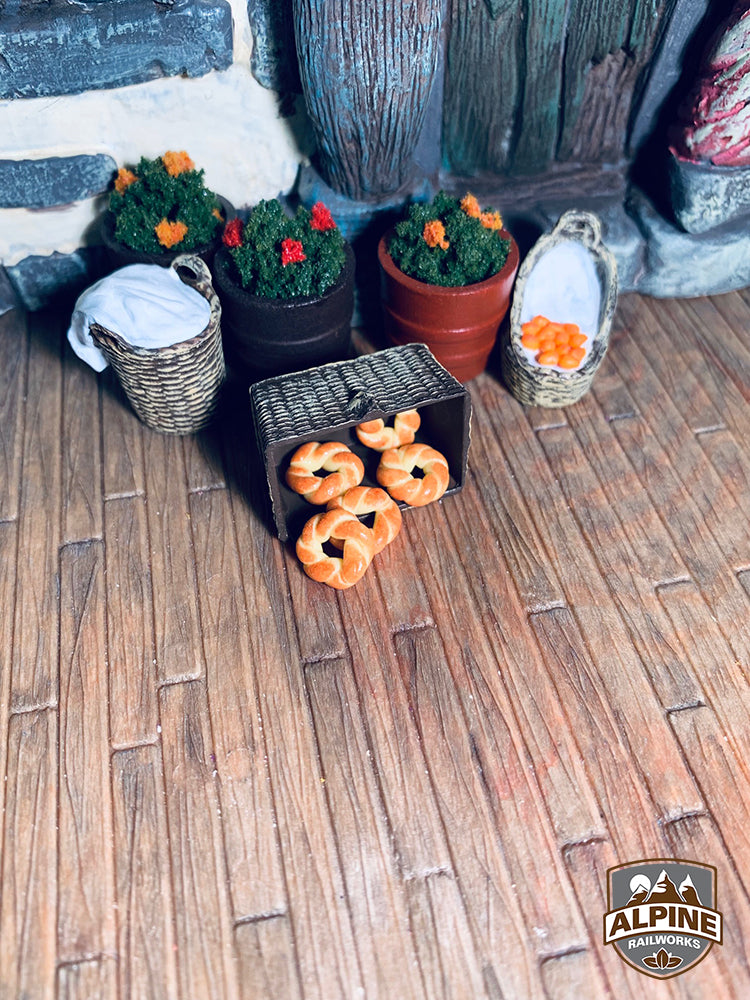 Figures and additional accessories are pictured for illustrative purposes only, and are not included. These G Scale miniature food pieces will fade in color with prolonged exposure to sunlight. This is a genuine Alpine Railworks product.