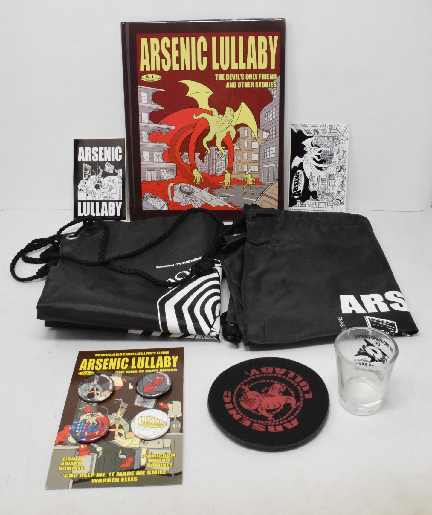 Includes HC with signed remark, pin set, 2 stickers, 2 tote bags, coaster, shot glass