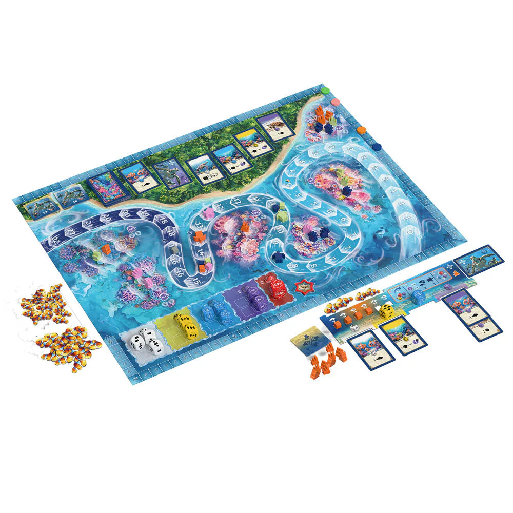Off the east coast of Australia is an underwater superhighway, a warm stretch of ocean called the East Australian Current. Here, your sea turtles swim amidst beautiful flora and fauna. Each round you choose dice which offer various advantages in this diverse ecosystem: select food cubes to feed ever-growing schools of fish, settle corals onto reefs, swim further down the current with your sea turtles or choose to be the first player to pick dice in the next round.
