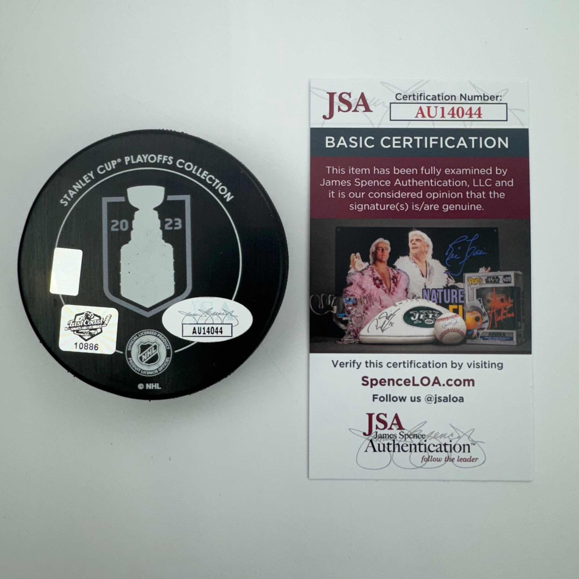 Autographed/Signed Alec Martinez Las Vegas Golden Knights 2023 Stanley Cup Logo Hockey Puck JSA COA