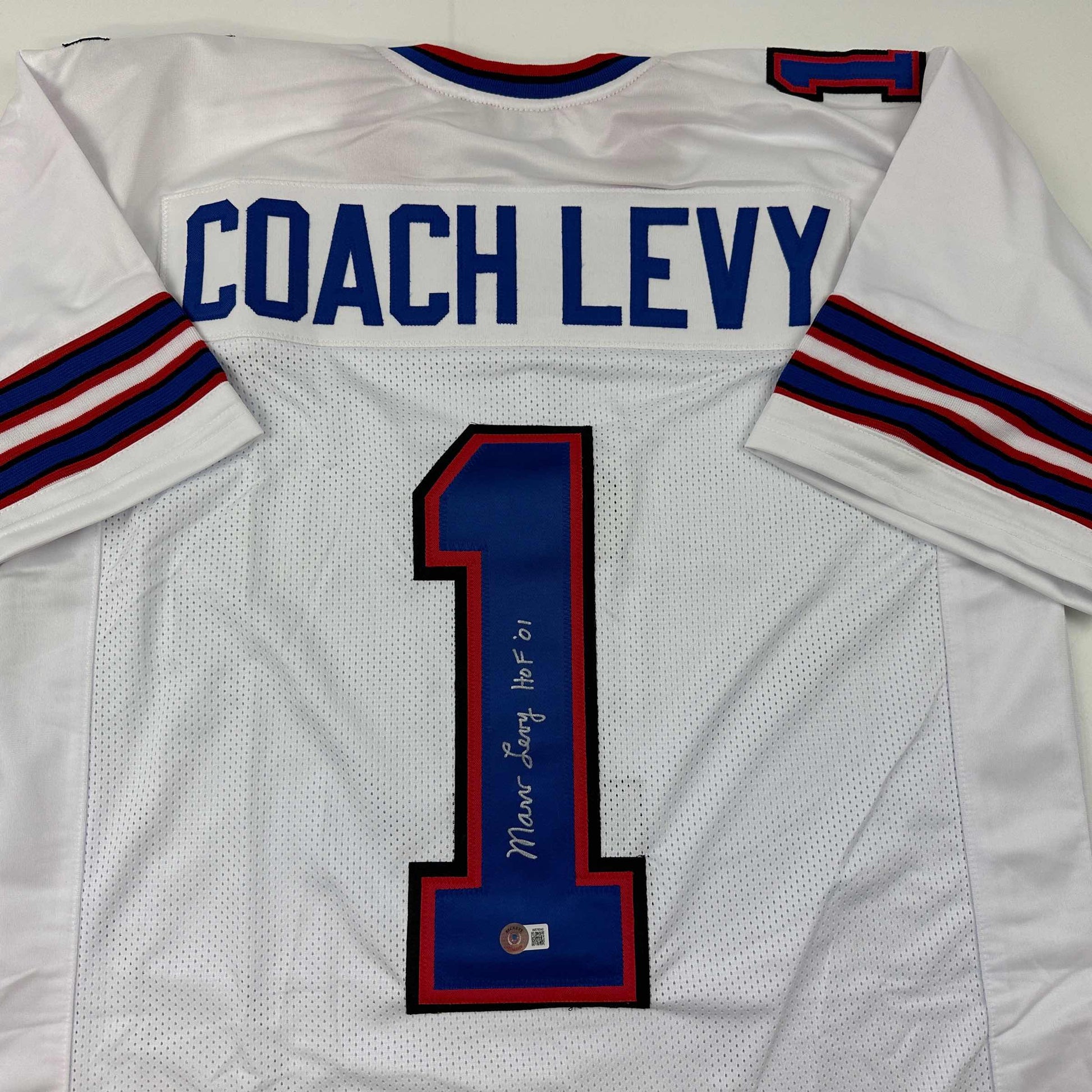 Autographed/Signed Coach Marv Levy HOF 01 Buffalo White Football Jersey Beckett BAS COA
