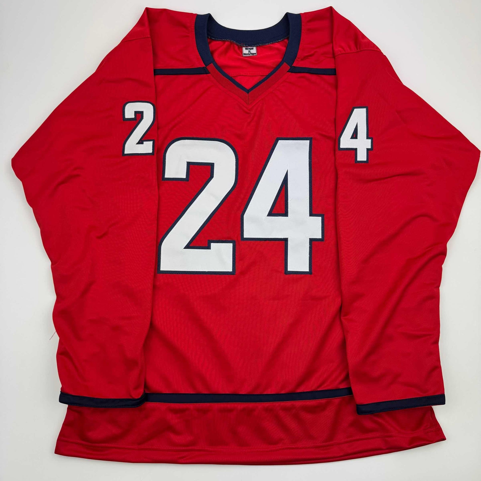 Jersey has no brand names or logos. This is a custom jersey and was not manufactured by or in any manner associated with any professional sports league or manufacturer. This custom jersey carries no professional sports league designation. The item is intended to be an autographed collectible. The custom jersey displays the name and number of the player. This item in no way is affiliated with or connected to any professional sports organization. Size is XL.