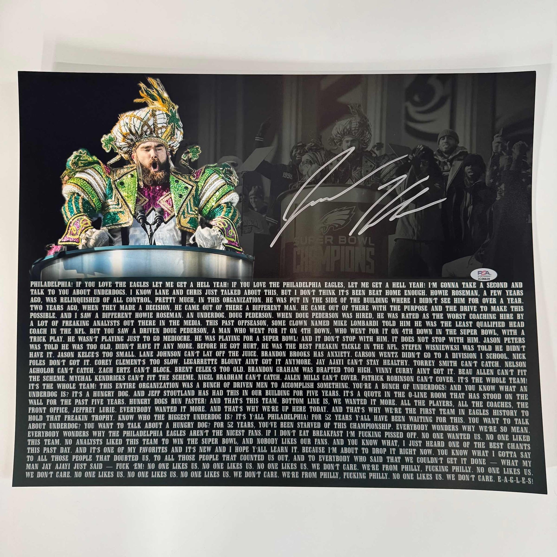 Autographed/Signed Jason Kelce Super Bowl Parade Speech Transcript Mummers Philadelphia Eagles 16x20 Football Photo PSA COA