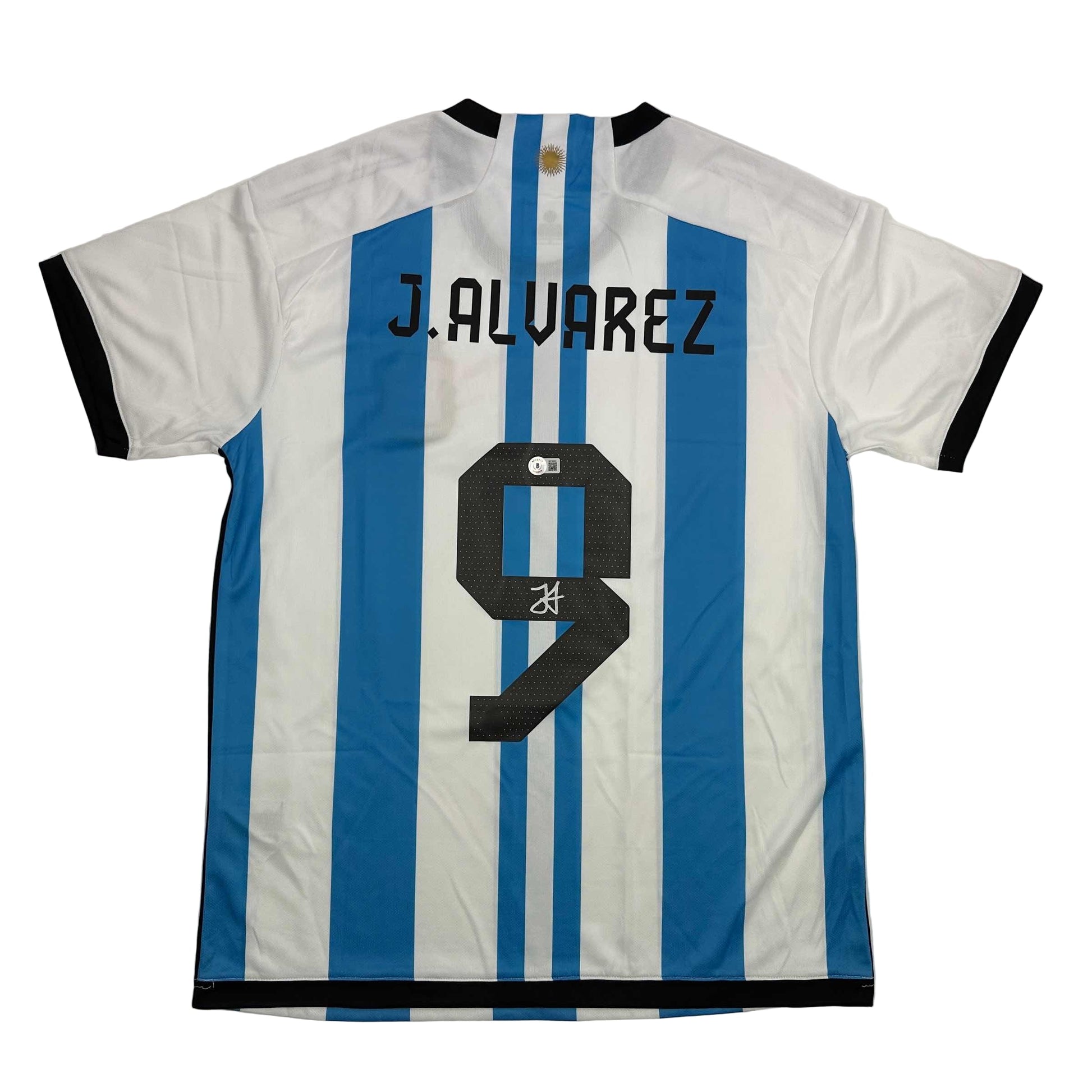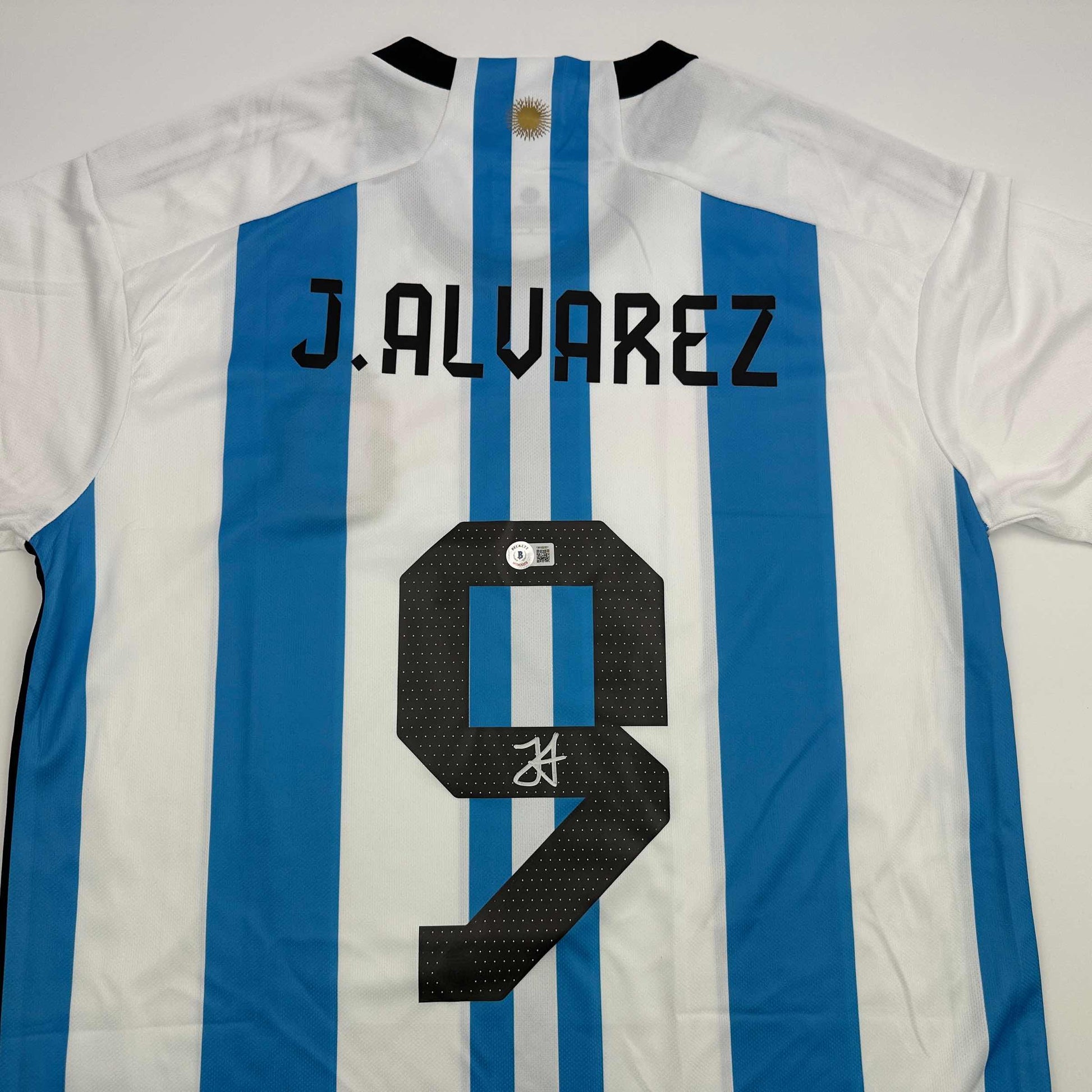 Autographed/Signed Julian Alvarez Argentina Blue/White Soccer World Cup Jersey Beckett BAS COA