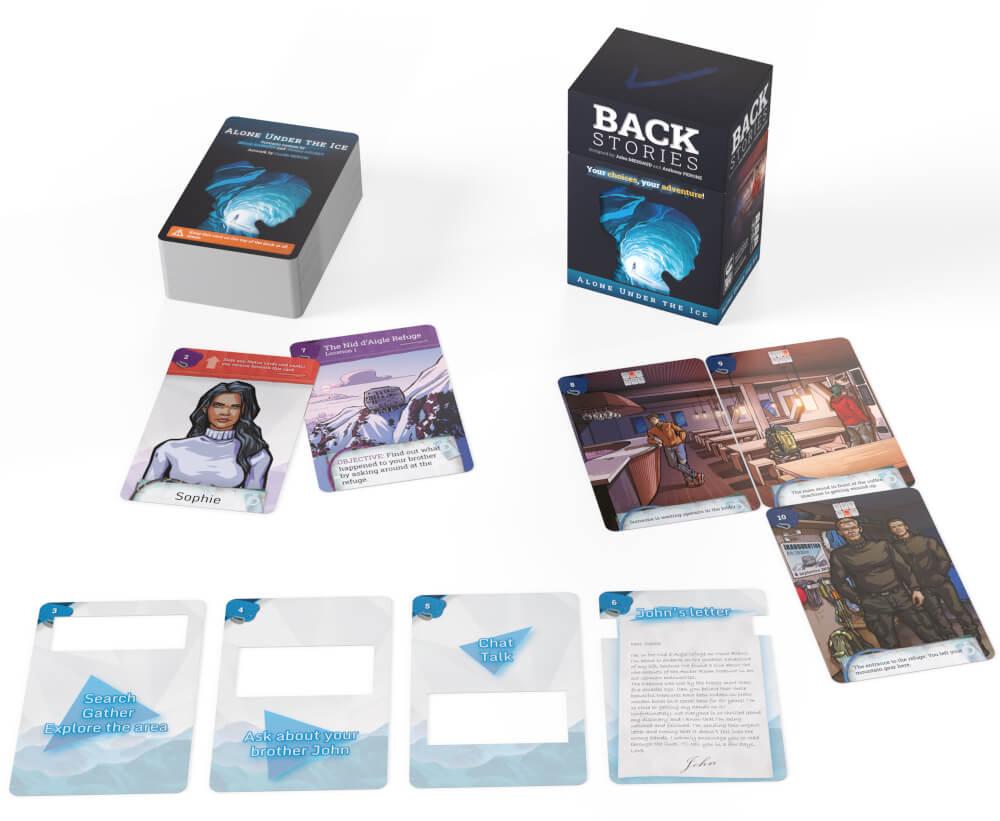 Backstories works with a “point & click”. Choose an action (Search, Discuss, Explore, etc.) and place it on the back of a card. Place and reveal the consequences of your choices thanks to a clever punched card system. You make your own choices... But be careful; each choice has its share of consequences. You alone will be master on board! Your choices, your adventure!