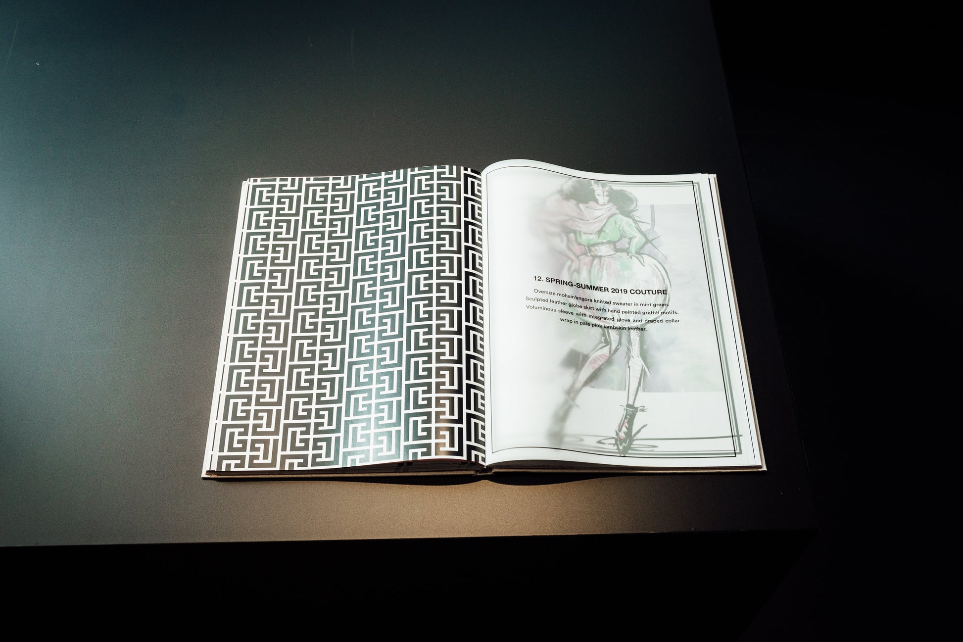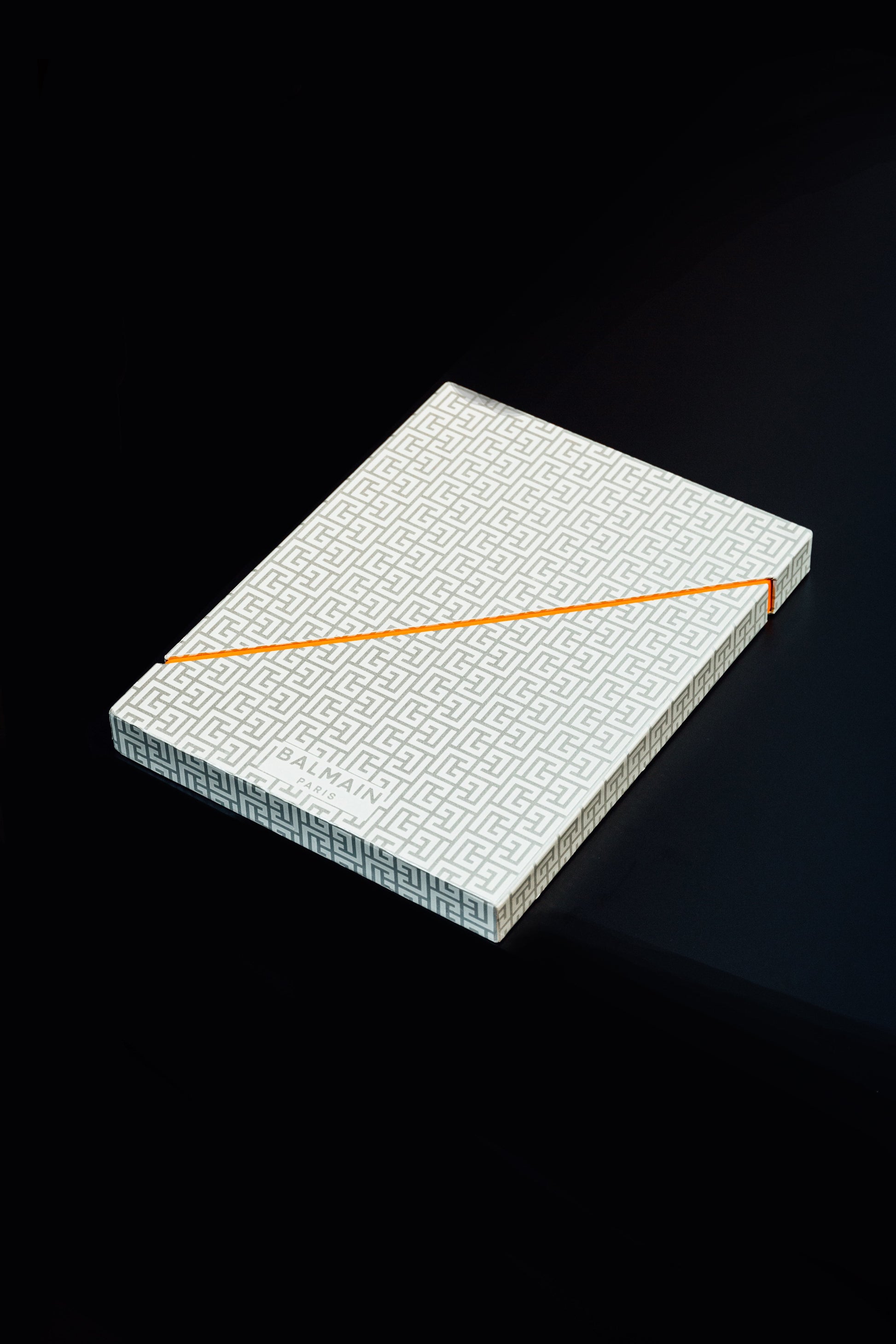 Orange fabric bound book embossed with Balmain's iconic monogram.