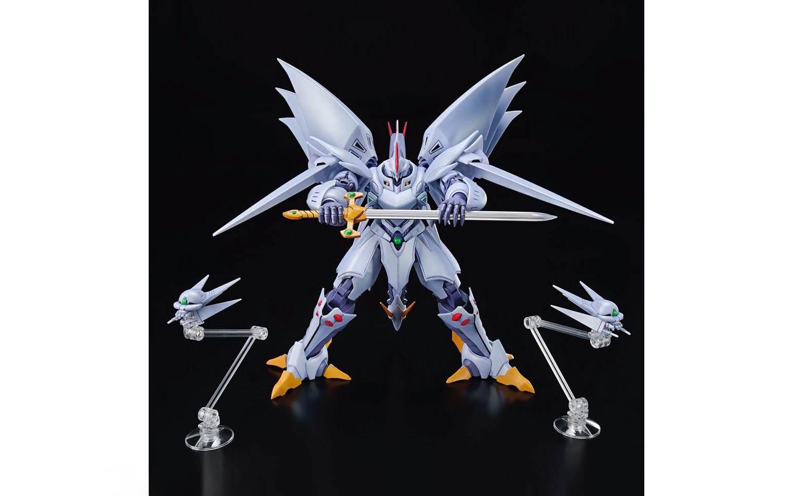 The HG Cybaster has impressive articulation, allowing for a wide range of dynamic poses that are faithful to its appearances in the games. Includes the ability to transform into its "Cybird" flight form through part recombination. The kit comes with its signature weapons, including the "Dis-Cutter" sword and two "High Familiars" (small remote-controlled units).