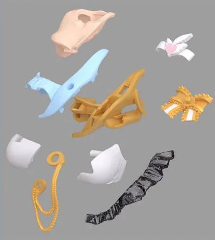 Three types of chest parts are included. The small wings on the back of the outfit are also carefully designed for easy assembly. The heart on the chest has a plastic seal to express its clear texture, and the skirt is made of a sheet with a pattern printed on it to create a wavy shape! The skin parts of the kit are given a matte finish to create a soft-looking, light-reflecting effect. Expressive interchangeable hands are included, too!