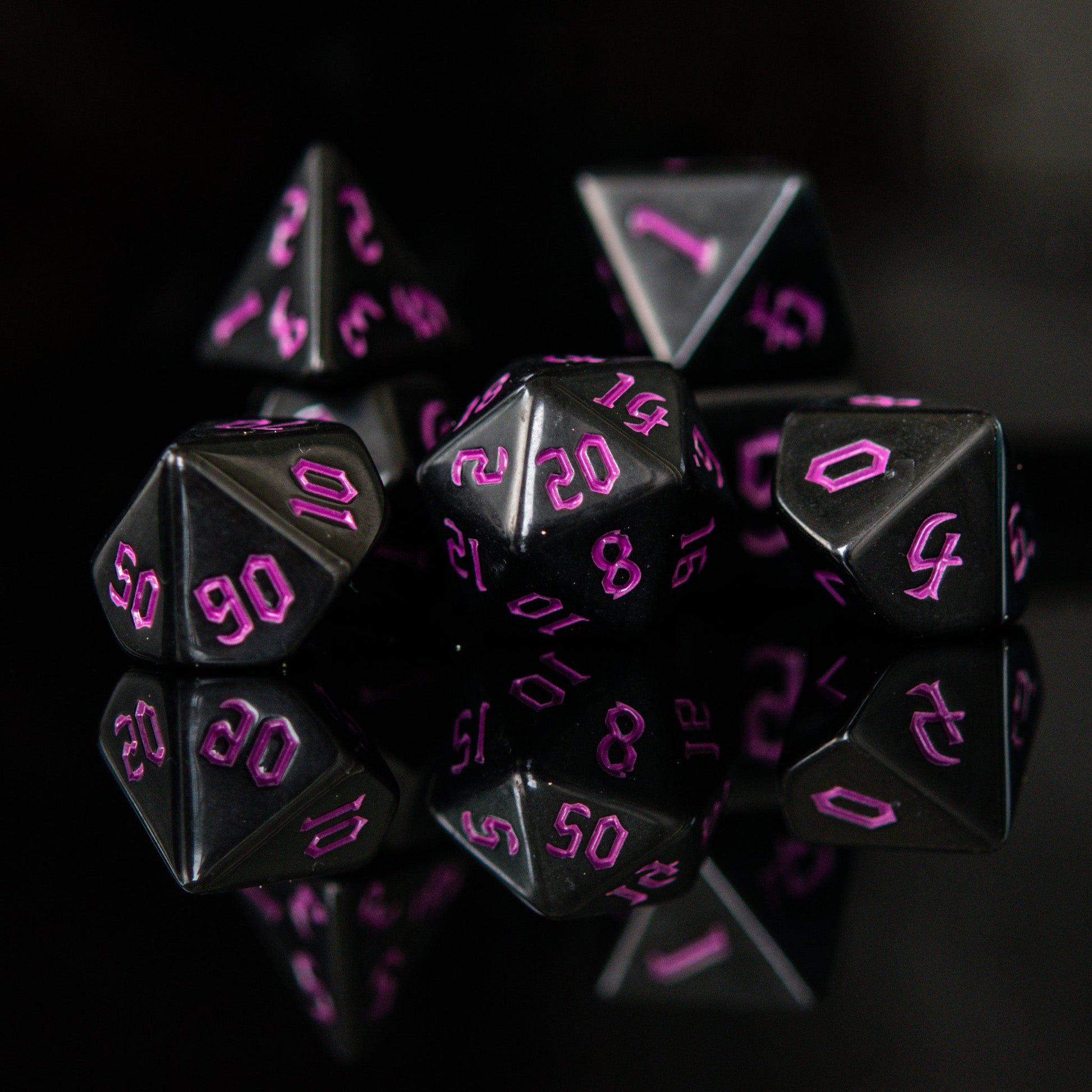 Our acrylic dice are carefully poured into individual molds and cured inside a vacuum chamber to insure no air bubbles are trapped inside the dice. After curing, each individual die is removed from the mold and numbers are painted by hand. These dice are perfect for any RPG and will sure to impress at your upcoming session!