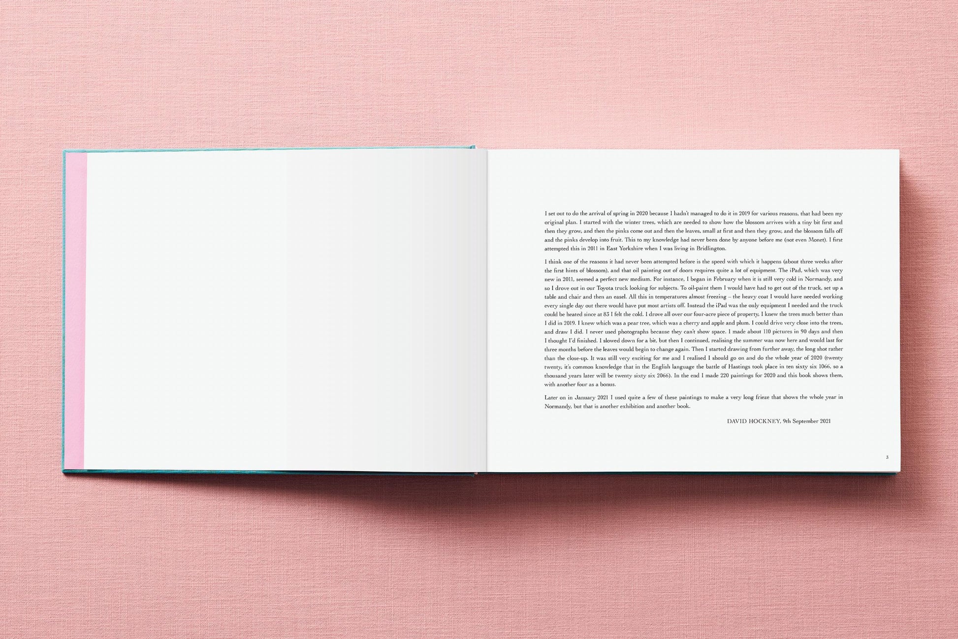 Now in an unlimited edition: David Hockney’s artist book of iPad paintings, made around a small farmhouse in Normandy during a year of lockdown. His vivid impressions of the changing light and landscape are brought from the glowing screen to the printed volume with a special six-color printing treatment, giving expression to every shade and hue.