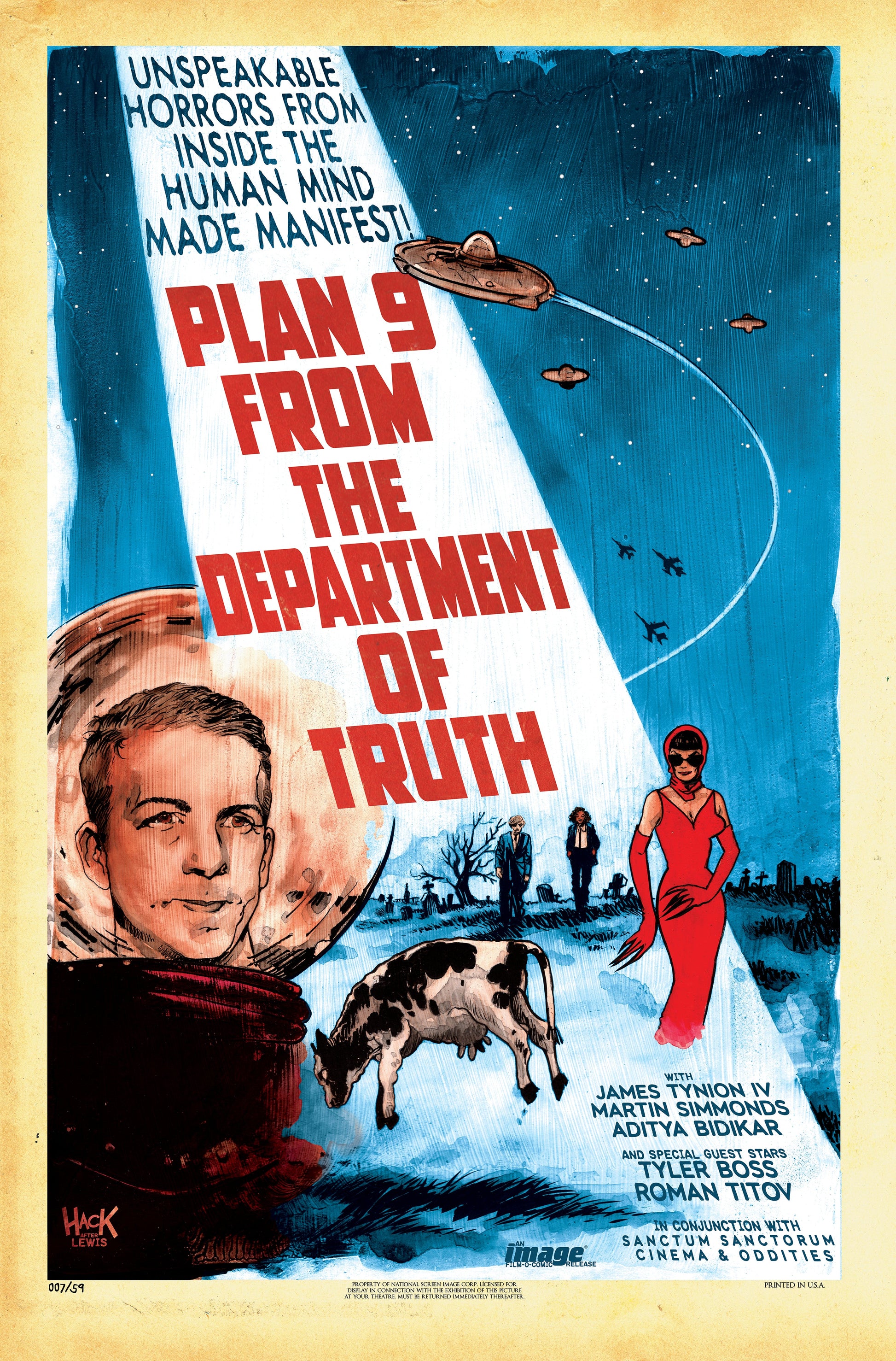 It's another deep dive into the Secret Archives as guest artist TYLER BOSS (4 Kids Walk Into a Bank) joins JAMES TYNION IV (Batman) and THE DEPARTMENT OF TRUTH to investigate sightings of flying saucers...and the strange men in black suits trying to cover up their existence. Hold onto your cows-the truth is out there!