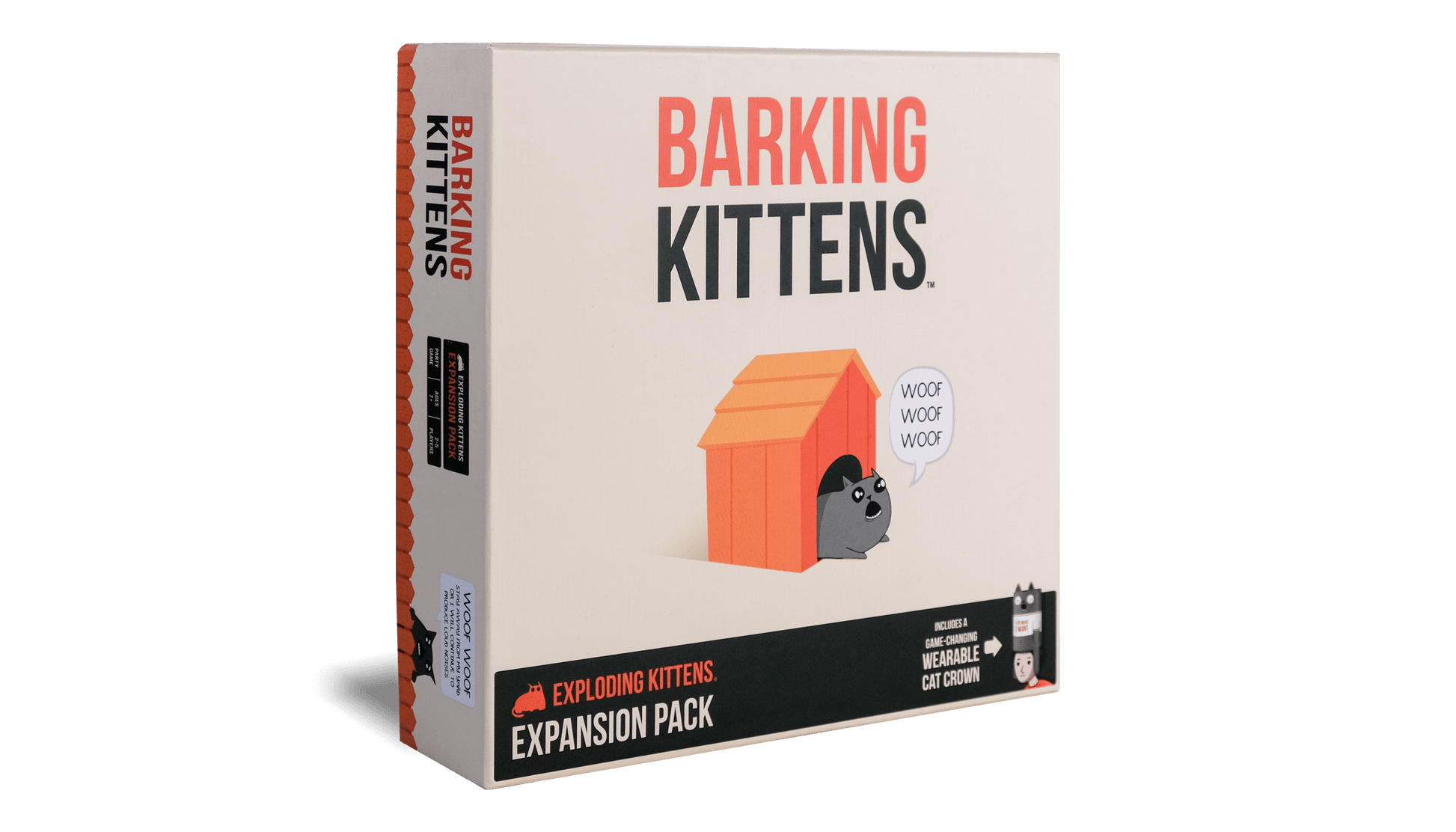 The third expansion to the record-breaking game, Exploding Kittens. Includes 20 cards and instructions that refresh the core game, adding a new level of strategy and hilarity. Includes a pair of Barking Kittens cards that allow players to combine their hands to one's advantage and the other's disadvantage. Also includes a wearable crown that allows you to hold a secret hand of cards on your head that no one can see until you decide to release them into the draw pile.