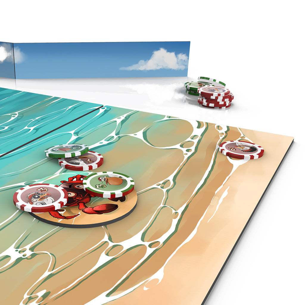 Fish N’Chips is a chip-throwing game, playable on a table, combining dexterity and tactics. In turn, each team throws chips of different values to score majorities on the different elements of the playmat.