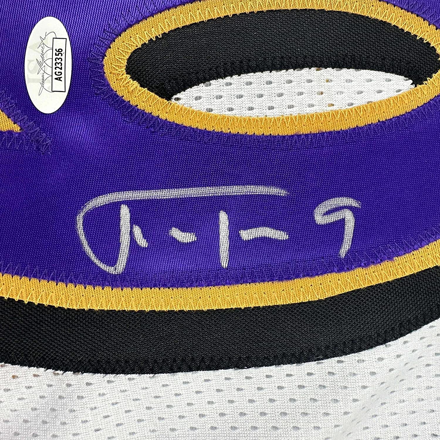 Framed Autographed/Signed Justin Tucker 35x39 Baltimore White Football Jersey JSA COA