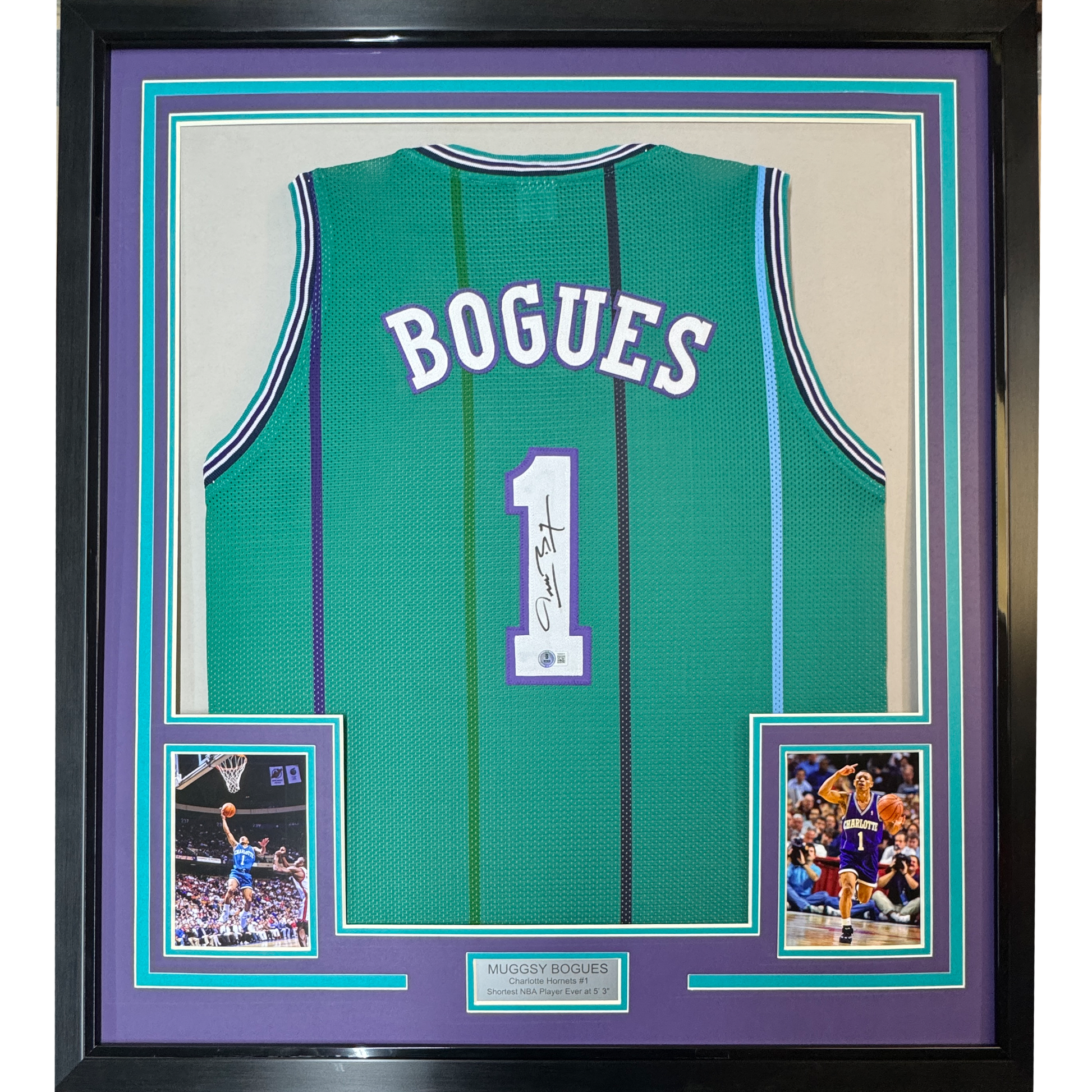 Framed Autographed/Signed Muggsy Bogues 35x39 Charlotte Teal Basketball Jersey PSA/DNA COA