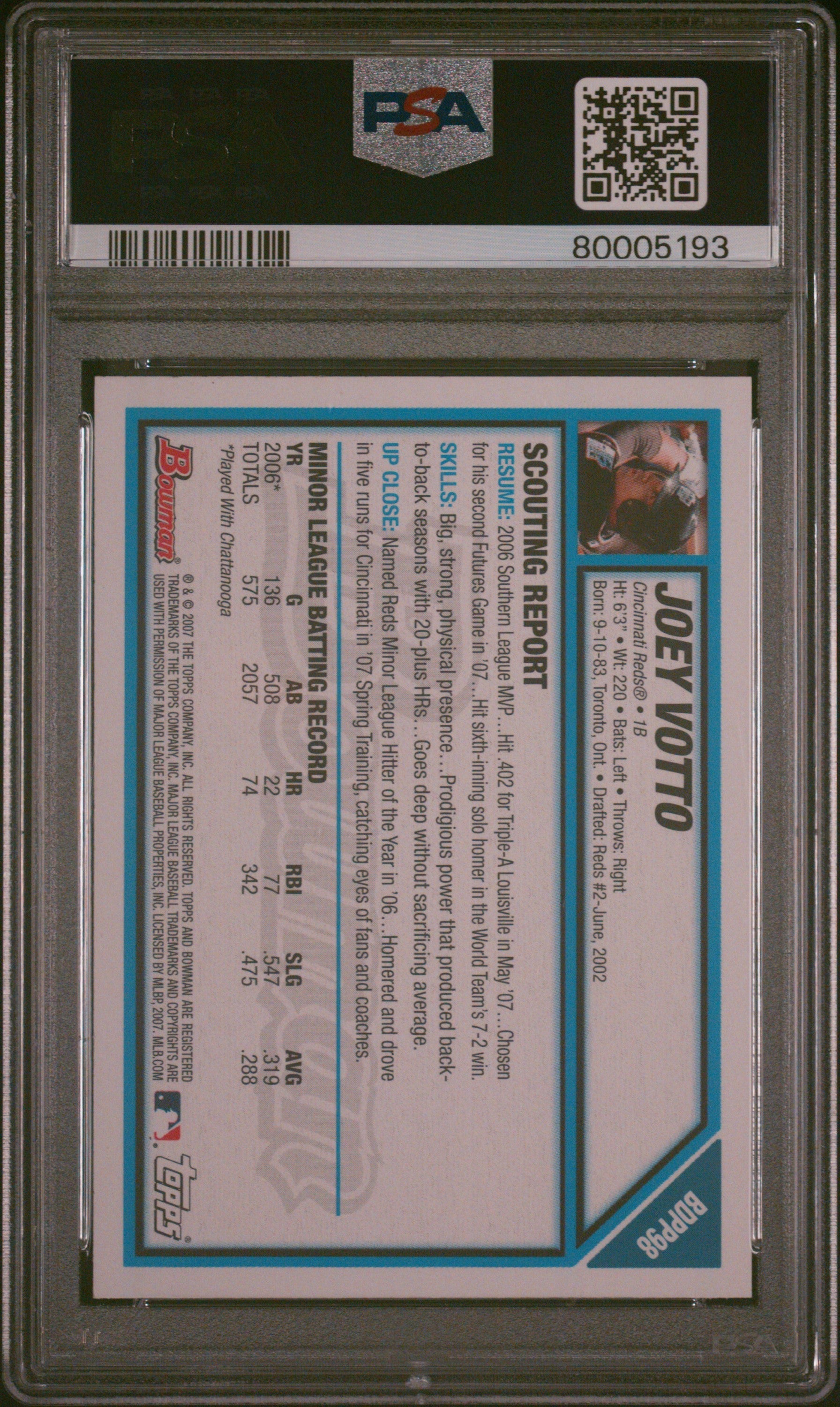 Graded 2007 Topps Bowman Joey Votto #BDPP98 Draft Picks & Prospects Rookie RC Baseball Card PSA 10 Gem Mint