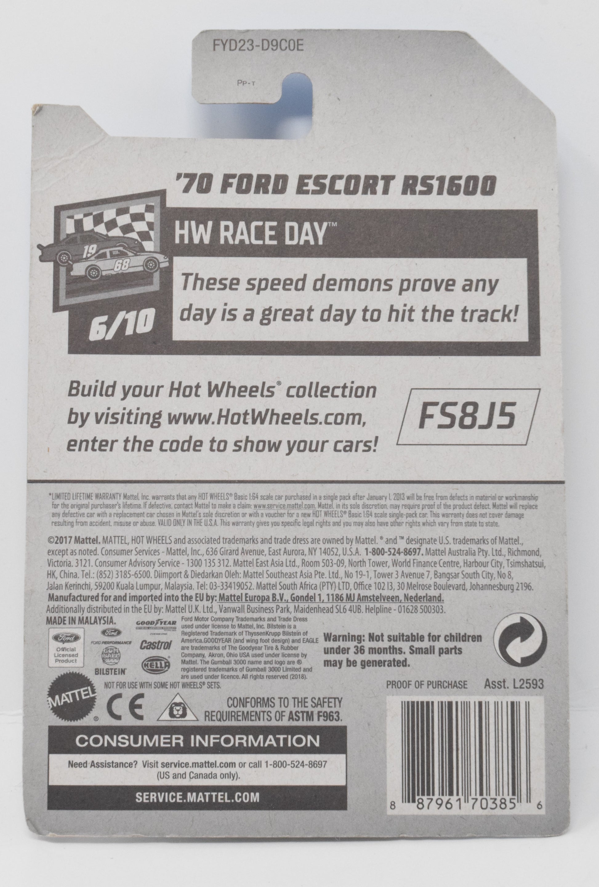 Hot Wheels 70 Ford Escort RS1600 HW Race Day Diecast Car White 6/10 102 New
