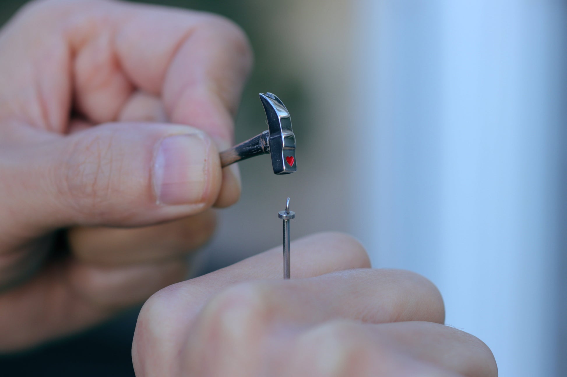 The Nobara's Hammer & Nail Pendant features a 3D hammer and nail design. The hammer stands 30mm tall & 4mm at its thickest & 4mm at its widest & the nails stand 11mm tall & 4mm at its thickest & 4mm at its widest.