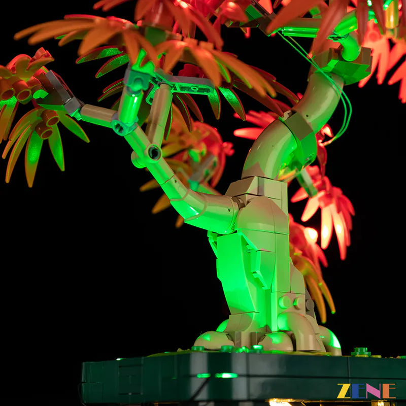 The ZENE Bricks Light Kit transforms the LEGO Japanese Red Maple Bonsai Tree 10348 into a mesmerizing illuminated masterpiece that captures the essence of autumn's beauty. This professional lighting solution features strategically placed LED elements that bring the miniature tree to life with warm, ambient illumination. The kit includes vibrant red and orange lights embedded within the delicate leaf clusters, creating a stunning gradient effect that mimics natural autumn foliage. Green accent lighting illuminates the base platform, while the tree trunk remains elegantly unlit to maintain authentic contrast. The sophisticated lighting design enhances the model's architectural details, making it perfect for display in any room where it serves as both art piece and conversation starter.