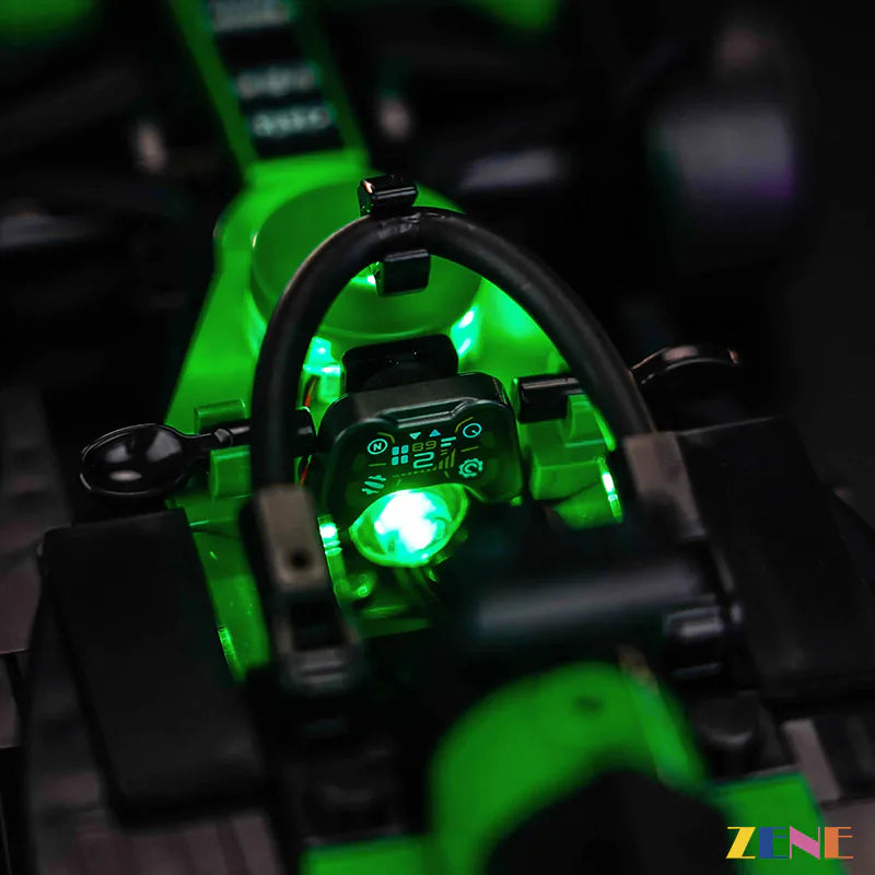 Experience the electric atmosphere of Formula 1 night racing with ZENE premium lighting kit designed exclusively for the LEGO KICK Sauber F1 Team C44 Race Car 77247. This spectacular lighting system bathes your model in vibrant green illumination that perfectly captures Sauber's distinctive livery and creates a dramatic racing atmosphere.