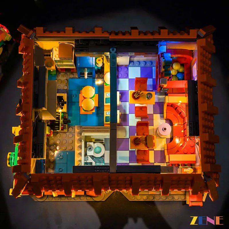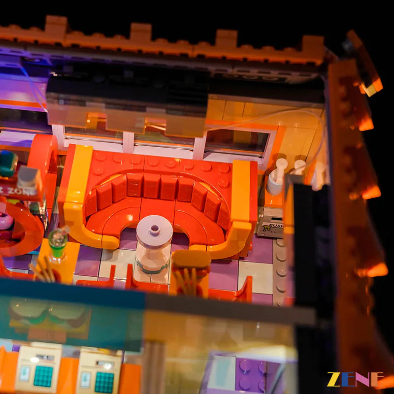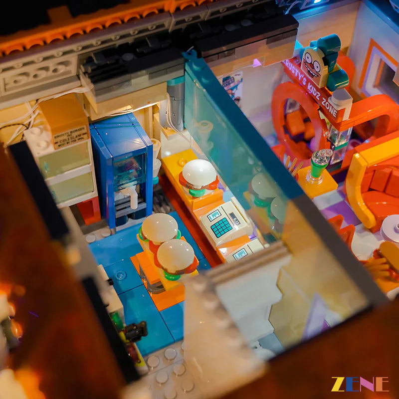ZENE Bricks Light Kit for LEGO The Krusty Burger Simpsons #10352 transforms the 1635-piece set LEGO 10352 The Simpsons: Krusty Burger revealed in June 2025! into a vibrant nighttime spectacle. This professional lighting enhancement illuminates Springfield's iconic fast-food restaurant with strategically placed LED strips around the rooftop perimeter, creating an authentic diner atmosphere. The kit features brilliant blue headlights for Homer's clown car, warm interior lighting throughout the kitchen, dining area, bathroom and drive-through LEGO® ICONS™ The Simpsons™: Krusty Burger and accent lighting for the famous Krusty Burger pole sign. Each LED component integrates seamlessly into the existing build structure, requiring minimal modification while delivering maximum visual impact. The sophisticated lighting design captures the essence of The Simpsons' animated world, making this display piece truly shine in any collection or room setting.
