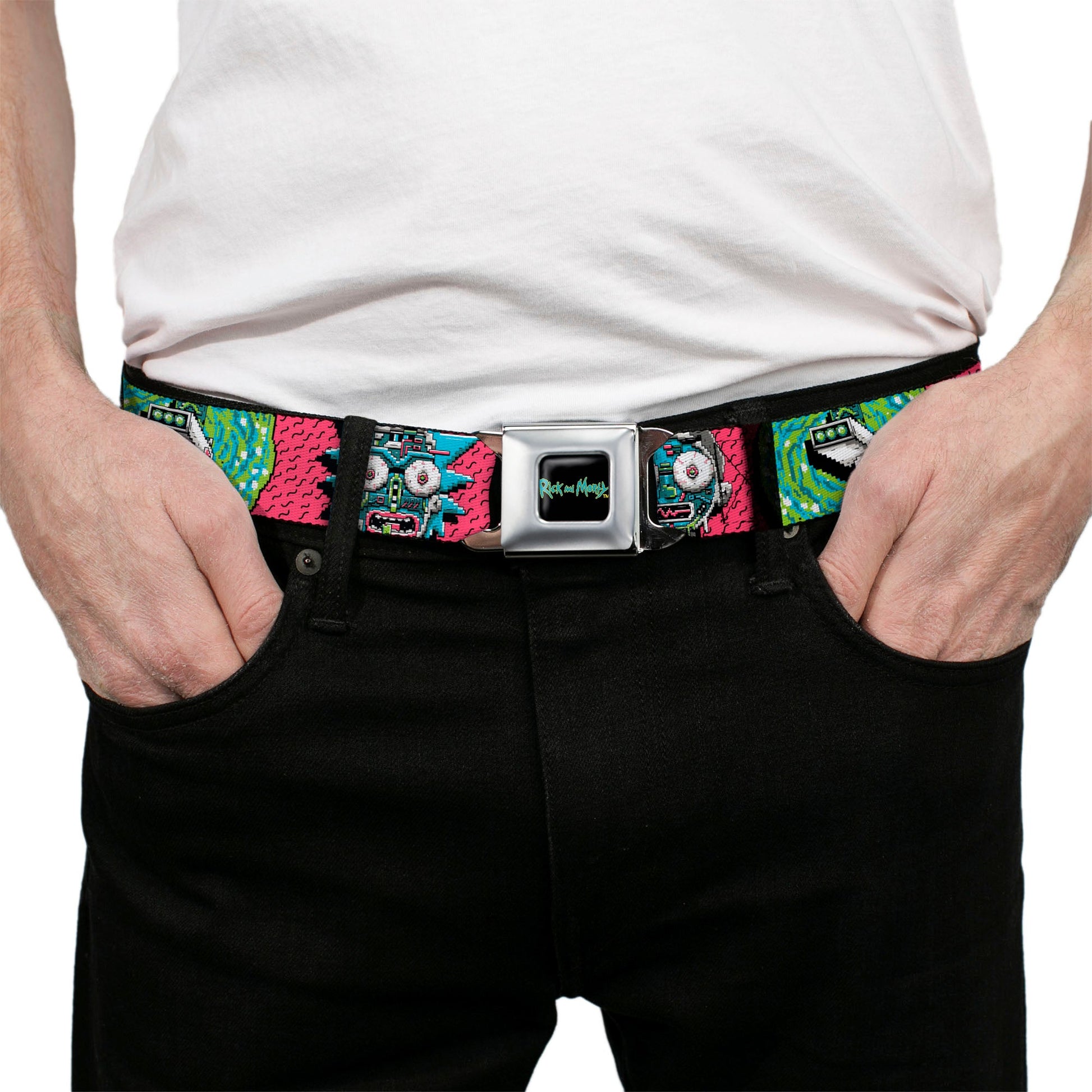 Buckle-Down's iconic Seatbelt Belt is a cool, smart, and exciting blend of fashion and function. Always a conversation starter, our Seatbelt Belt adjusts to perfectly fit your waist while showcasing your unique sense of style. Our Seatbelt Belts are made with authentic automotive style seatbelt buckles making them easy to open and close at the push of a button. Our adult-size Seatbelt Belts are 1.5 inches wide and our kid-sized Seatbelt belts are 1.0 inch wide. This product is Handcrafted in USA by Buckle-Down Inc. and officially licensed by Rick and Morty.
