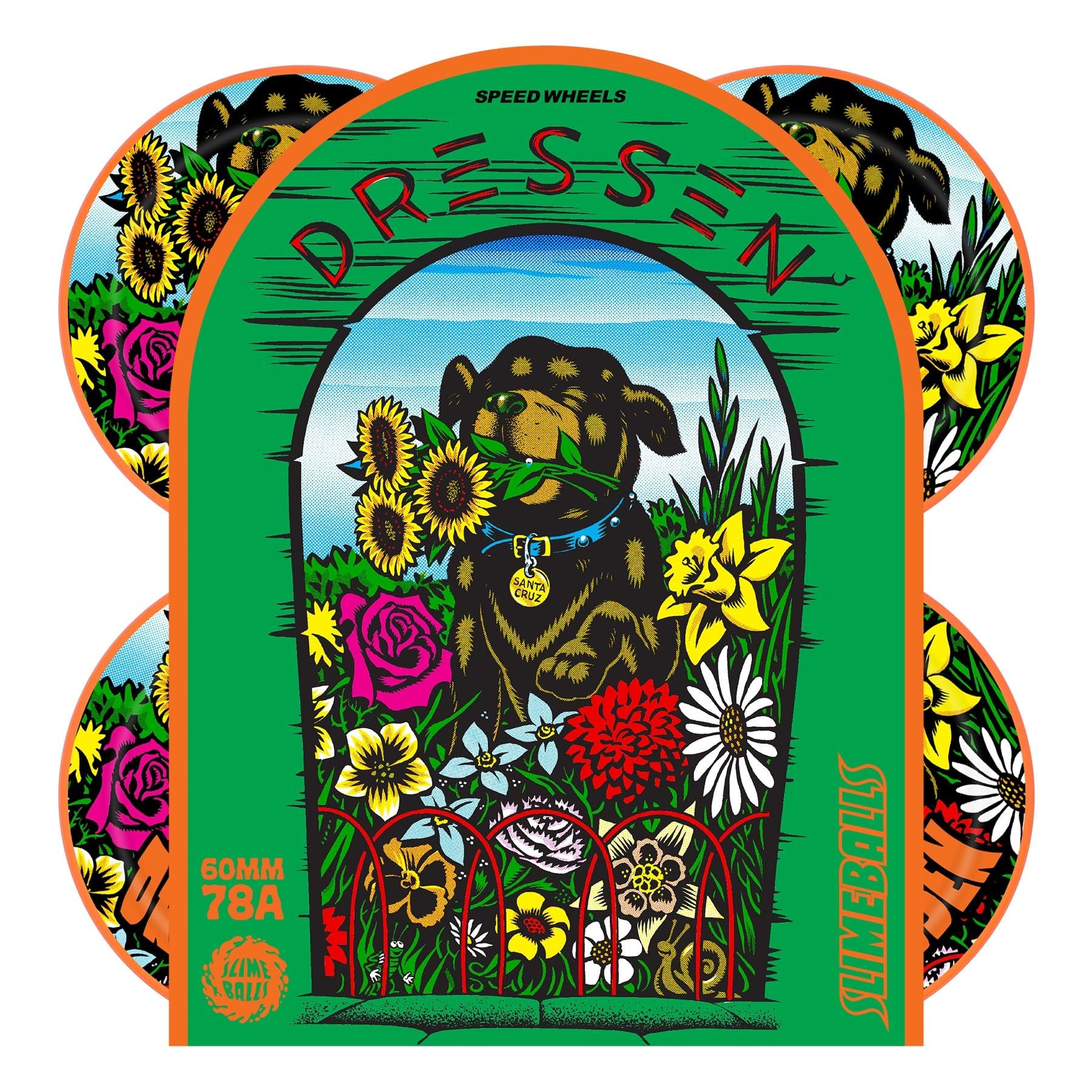 Slime Balls 60mm, 78a Eric Dressen Pup Reissue OG Slime wheels in orange with black core featuring Santa Cruz graphics originally drawn by Jim Phillips.